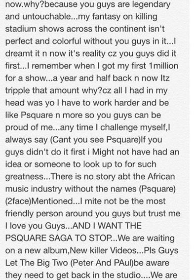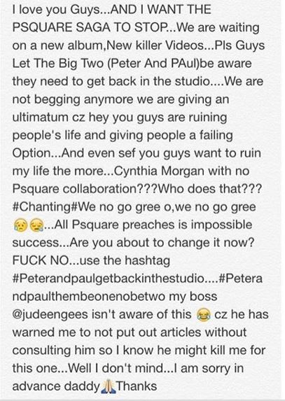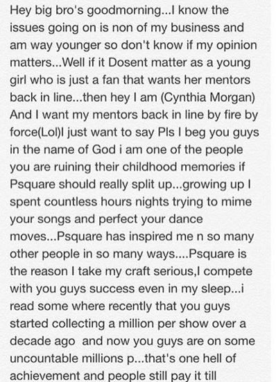 Cynthia Morgan who is signed to Jude Okoye's record label, Northside Music, this morning shared an open letter she wrote to Paul and Peter Okoye of PSquare on Instgram over their recent family crisis.