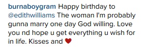 What got the attention of his fans was what he captioned the photo which states that she is the lady he loves and will probably marry in future. Check on what Burna Boy posted below;