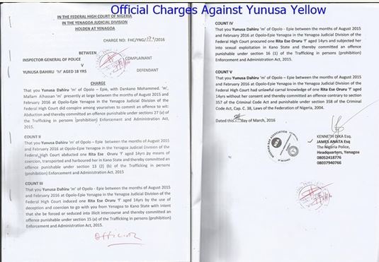 Yunusa Dahiru, aka Yellow, the suspected abductor of a Bayelsa teenager, Ese Oruru, was on Tuesday arraigned at a Federal High Court in Yenagoa, the Bayelsa State capital.