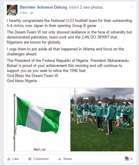 The Minister of Sports, Solomon Dalung has congratulated Nigeria's Dream Team for beating Japan in their first game at Rio 2016 Olympics. This is coming after he posted an article saying that the team went to Atlanta without approval.