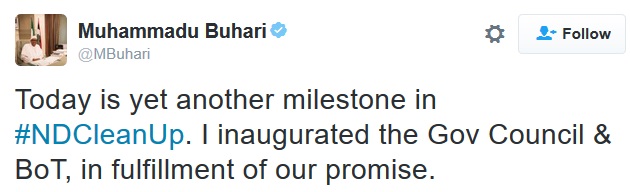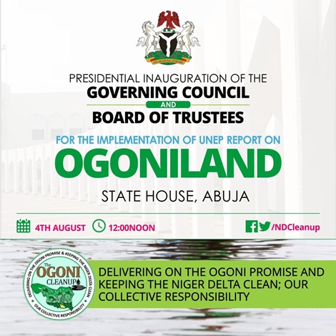 President Muhammadu Buhari, has today, August 4, inaugurated the Governing Council and Board of Trustees for the Implementation of the United Nations Environment Programme (UNEP) for the Ogoni Clean-up at the Statehouse Abuja.